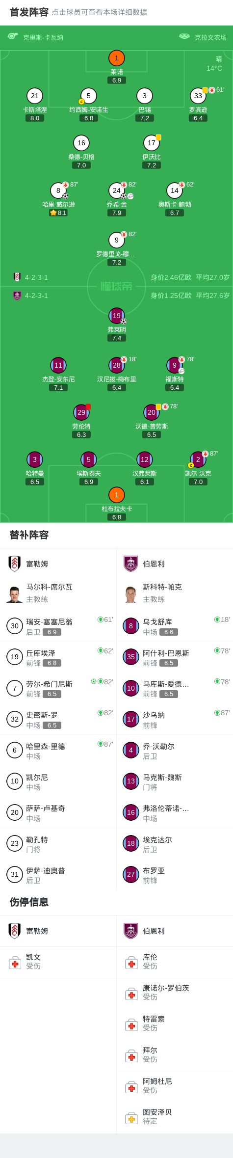 第90+5分钟,劳伦特禁区犯规染红,希门尼斯点射命中,富勒姆3-1伯恩利